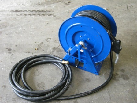 Haspel met brandstofslag voor bij de werkplaats.